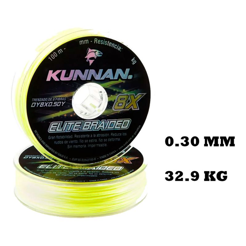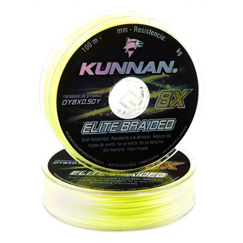 8X ELITE BRAIDED de KUNNAN® es el Multifilamento resultante de la aplicación de última generación tecnológica en el trenzado circular suave de 8 filamentos. Como resultado estas líneas delgadas resisten mayor peso, soportan mejor la abrasión y tienen una alta resistencia a la tirantez extrema. 0% de elasticidad asegura que las líneas no se deforman ni poseen memoria. La durabilidad en el color facilita su visibilidad. Su diseño es óptimo, permitiendo lanzamientos exactos a mayor distancia en condiciones extremas o turbulencias en el mar, ríos y lagos.