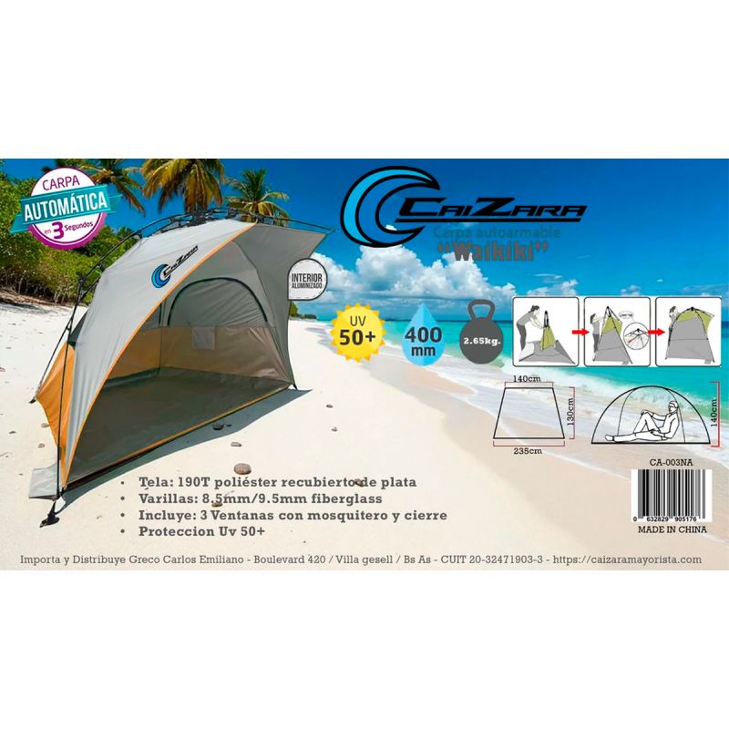 CARPA DE PLAYA AUTOMÁTICA CAIZARA - MODELO WAIKIKI ¡Armado instantáneo en 3 segundos!