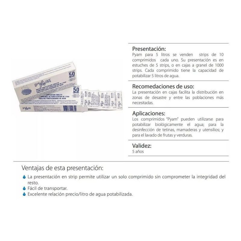 Los comprimidos y granulados PYAM, purifican biológicamente el agua, previniendo enfermedades de origen hídrico (tales como cólera, disenterías y otras) mediante la liberación de ácido hipocloroso en contacto con el agua. Es totalmente biodegradable, seguro para el medio ambiente e inocuo para los seres humanos y animales. Su fácil aplicación y dosificación lo hacen ideal para diversos usos, en el hogar y en campamentos u otras actividades al aire libre, ya que se trata de un proceso muy simple, al alcance de cualquier usuario no experimentado. Son, además, una excelente opción para brindar agua segura a personas afectadas por desastres naturales, o catástrofes humanitarias.