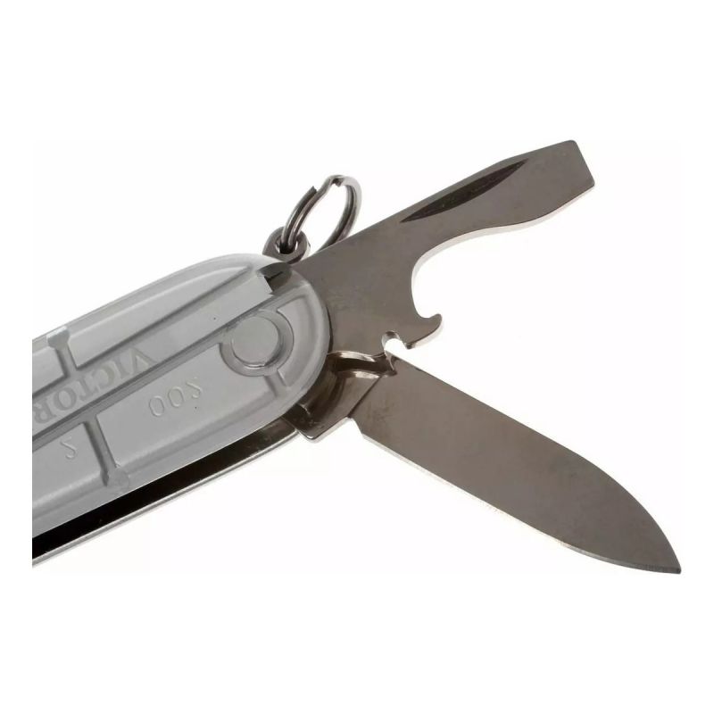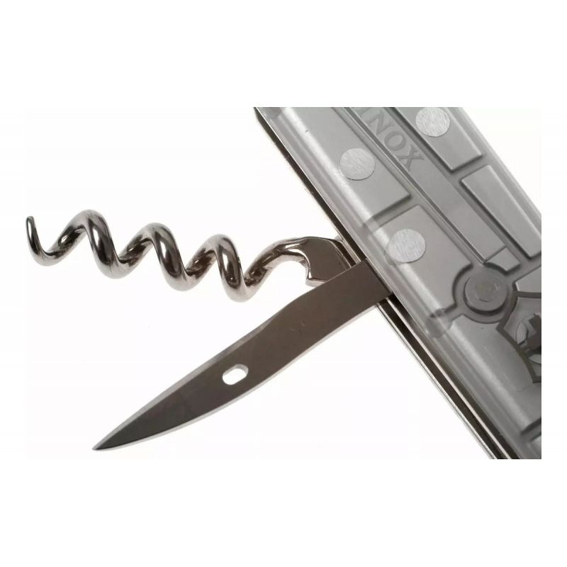 Hoja grande / Hoja pequeña / Sacacorchos / Punzón, escariador y aguja de coser / Anilla / Pinzas / Palillo de dientes / Abrelatas / Destapador / Destornillador 6 mm / Pela cables / Destornillador 3 mm
