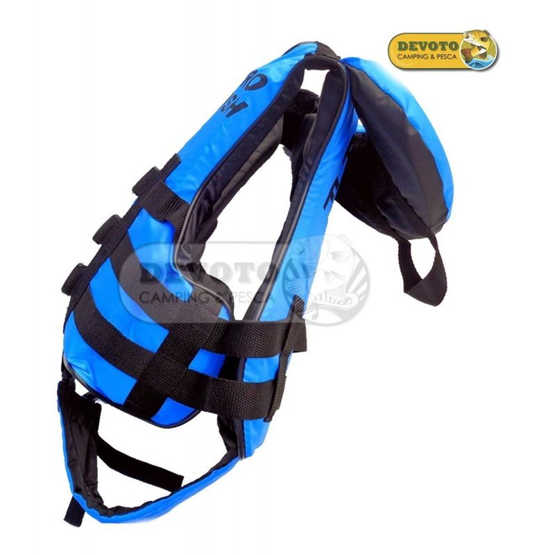 3) posee flotador pañalera o chiripá que ajusta el cuerpo por debajo, además de por el tórax.4) posee una correa de tracción en el flotador nucal.