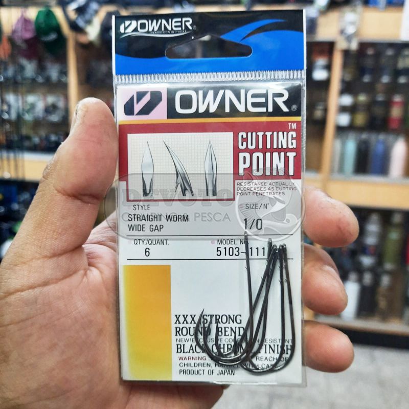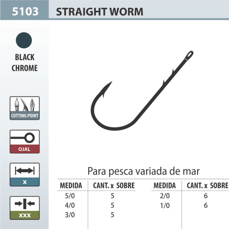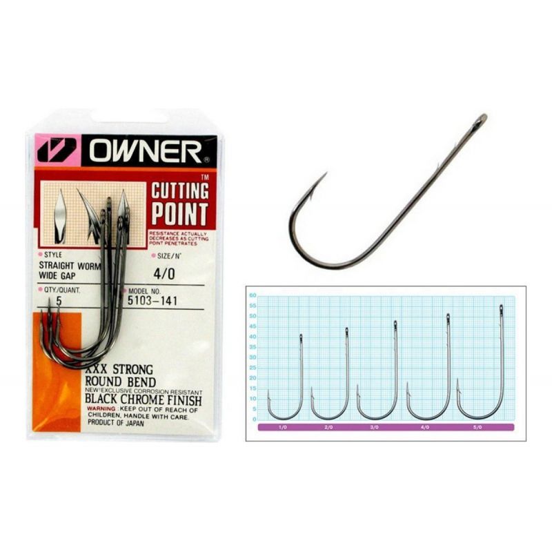 El anzuelo Owner Straight Shank Wide Gap 5103 se caracteriza por tener una curvatura redondeada, una punta de tres filos gracias a la tecnología patentada Cutting Point, y un acabado en negro cromado anticorrosivo. Este anzuelo además dispone de dos salientes (trabas) en la parte interior de la caña, que ayudan a evitar el desprendimiento de carnada, posee fortaleza 2X Strong.