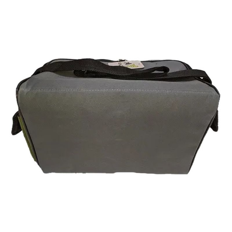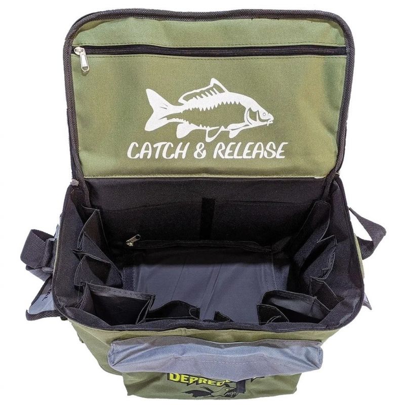 Bolso diseñado especialmente para el pejerrey, aunque puede ser usado para cualquier pesca. Posee 1 amplio bolsillo frontal con cierre y 2 compartimentos laterales con velcro para un rápido acceso. Posee un cómodo interior con 10 bolsillos complementarios (Ideal para las líneas) y un divisor con tabla para filetear carnada. Además, su correa de transporte es regulable.