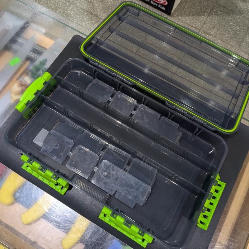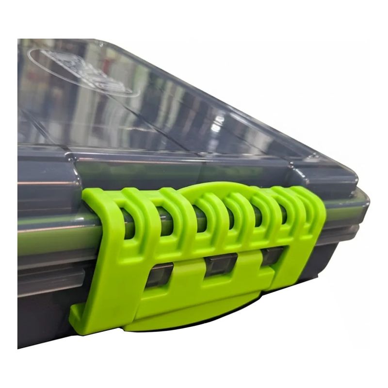 El interior está distribuido en 3 filas longitudinales con 12 divisores removibles, permitiendo personalizar los compartimentos según el tamaño de los señuelos o herramientas a organizar.