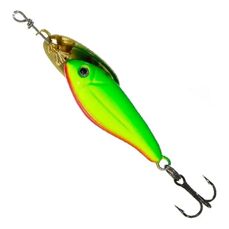 Acción rapida de minnow con cuchara giratoria. La acción rapida del señuelo del cuerpo de madera de balsa combinada con el tentador destello de un spinner en línea hace que esta sea una combinación muy efectiva.