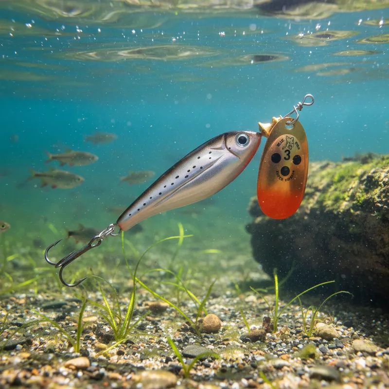 Acción rapida de minnow con cuchara giratoria. La acción rapida del señuelo del cuerpo de madera de balsa combinada con el tentador destello de un spinner en línea hace que esta sea una combinación muy efectiva.