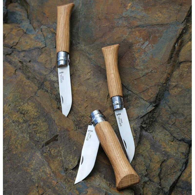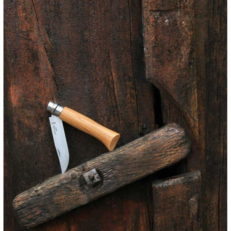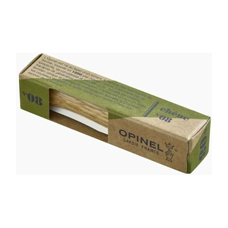 El Opinel N°8 es el tamaño más popular y versátil de la creciente línea de navajas plegables Opinel. Esta navaja es lo suficientemente pequeña como para usarse como navaja de bolsillo y su hoja de 8cm es capaz de cubrir la mayoría de sus necesidades de corte. La madera de roble es una madera dura, especialmente para los insectos y los hongos gracias a un alto contenido en tanino. Proveniente de explotaciones francesas, presenta un aspecto marrón amarillento, con unas venas rectas y regulares. El mango barnizado está protegido de las manchas y la humedad. La hoja está hecha de acero inoxidable Sandvik 12C27, que no se oxida; sin embargo, trate de evitar dejar su navaja Opinel en ambientes húmedos durante demasiado tiempo y seque la hoja después de cada uso.