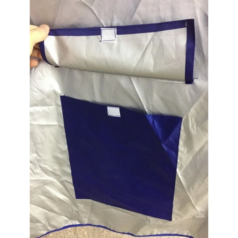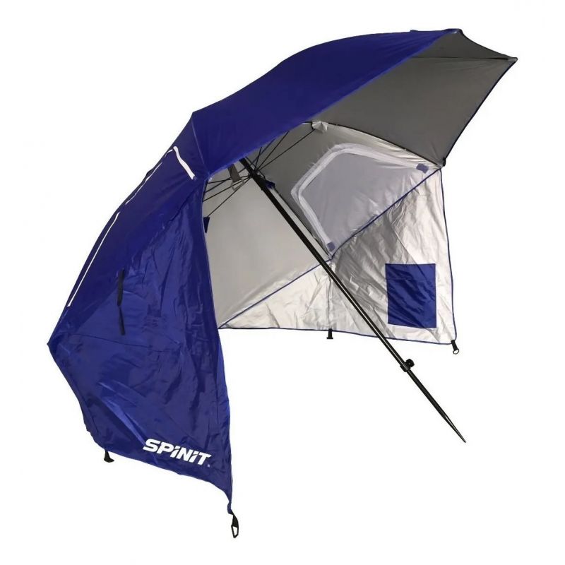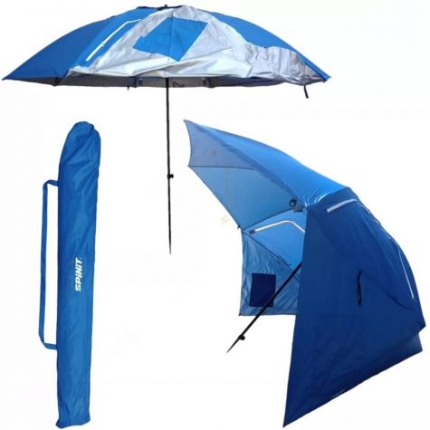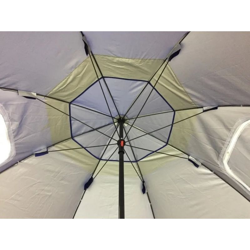 Posee un faldon desmontable a cada lado para poder hacer un mejor reparo del viento y dar una mayor sombra. Tambien posee dos ventanas con cubre ventana y bolsillos internos para llenar de arena y afirmar mejor la sombrilla.