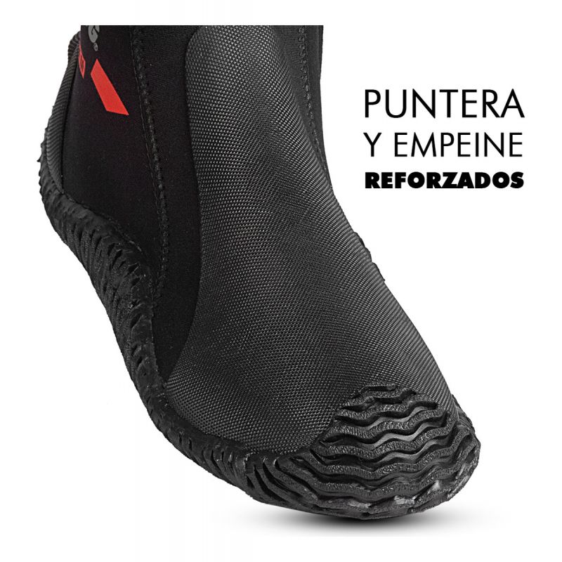 Calzado de neoprene de 5 mm, con suela de goma blanda.