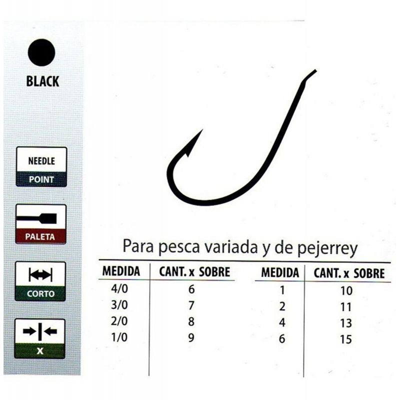 Anzuelos negros de paleta, con muy buena curvatura o "garganta" ideales para todo tipo de pesca.