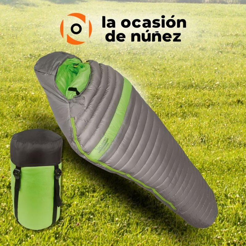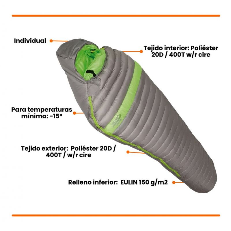 Su formato momia y relleno de 80% pluma y 20% duvet complementan una bolsa ideal para temperaturas bajas de hasta -15º extremo y -5 a 10º grados confort.