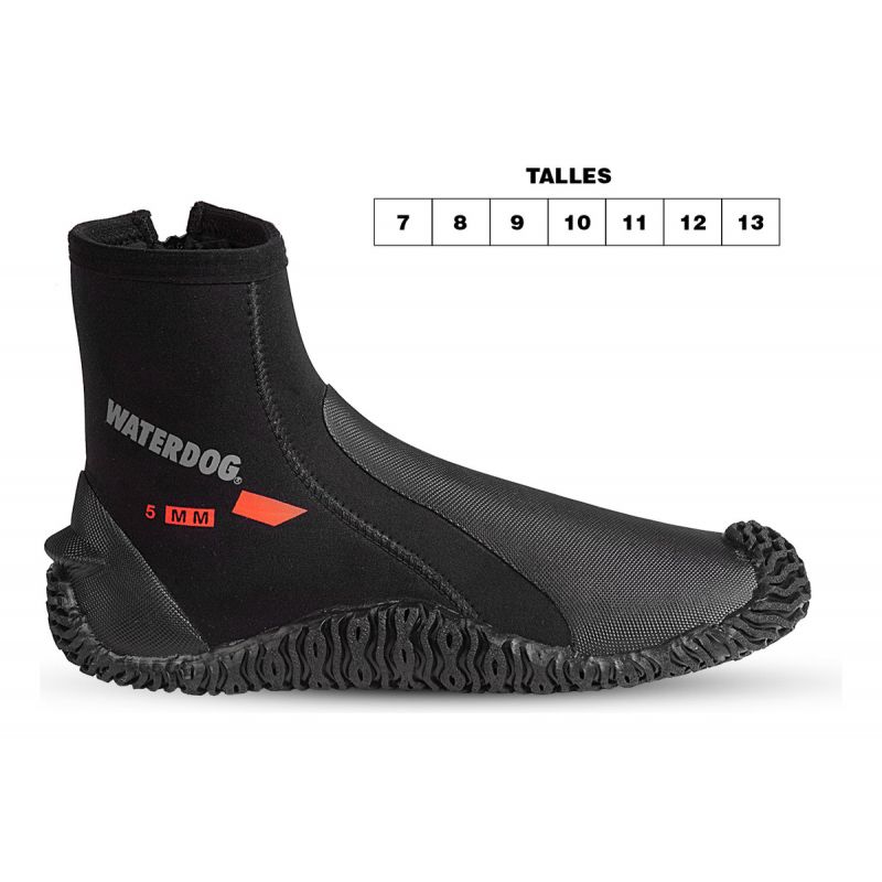 Calzado de neoprene de 5 mm, con suela de goma blanda.