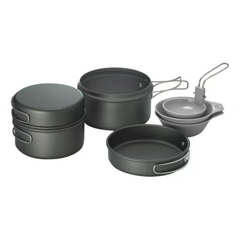El Solo 2 es un juego de utensilios de cocina de anodizado duro de aluminio de alta calidad. La tapa de la olla se puede usar como sartén. Este juego incluye una olla de 1.2 L, una olla de 0.9 L, 2 cuencos de plástico, 2 cucharas plegables y 1 bolsa de malla.