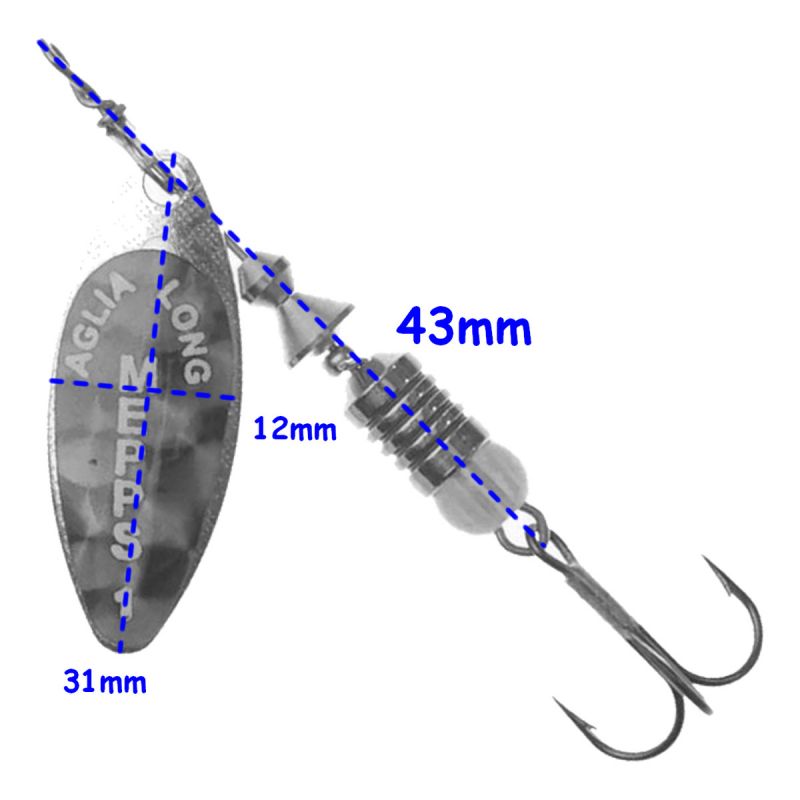 La Cuchara Mepps Aglia Long es la número uno del mundo, con un ángulo de giro de 30 grados y baja resistencia. Cabe destacar que la resistencia varía ligeramente según la velocidad de recuperación. Esta característica es la clave de su récord de capturas. Gracias a su acción consistente