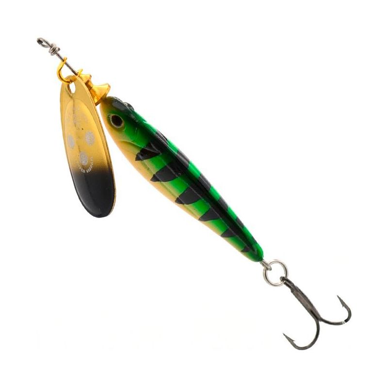 Acción rapida de minnow con cuchara giratoria. La acción rapida del señuelo del cuerpo de madera de balsa combinada con el tentador destello de un spinner en línea hace que esta sea una combinación muy efectiva.