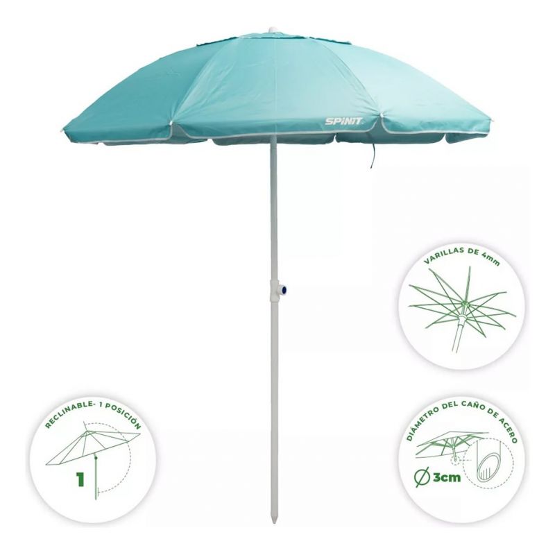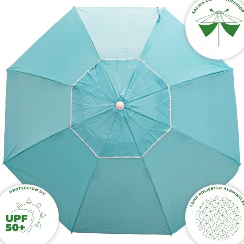 Sombrilla playera con salida de aire para disminuir resistencia al viento. Incluye bolso de transporte: