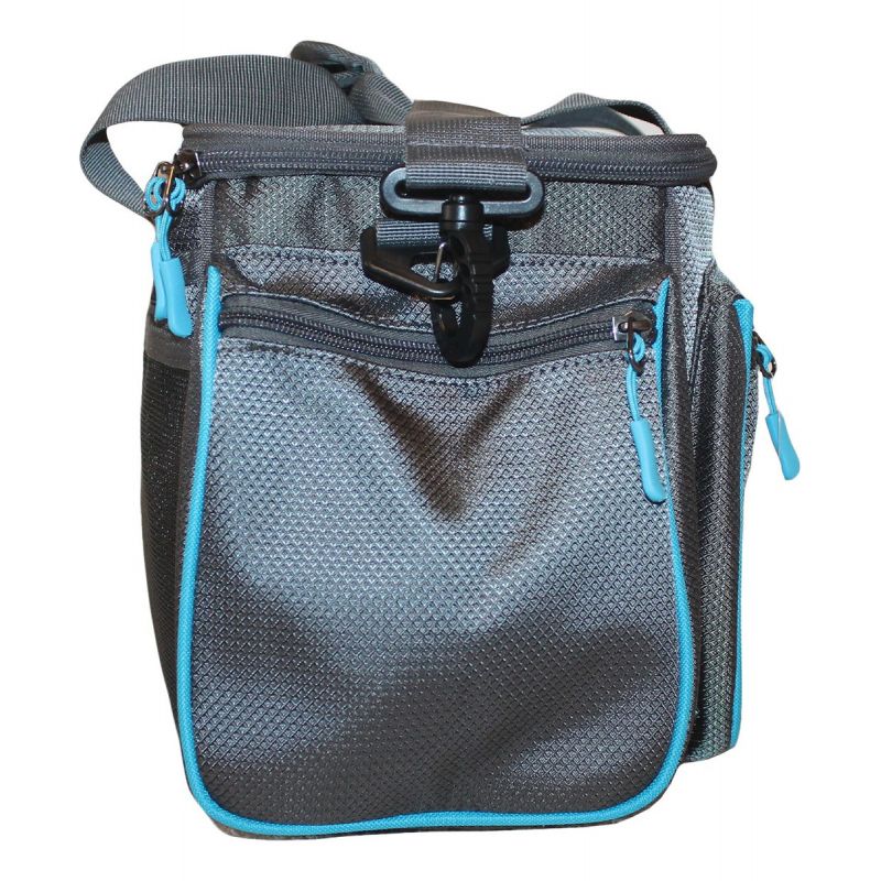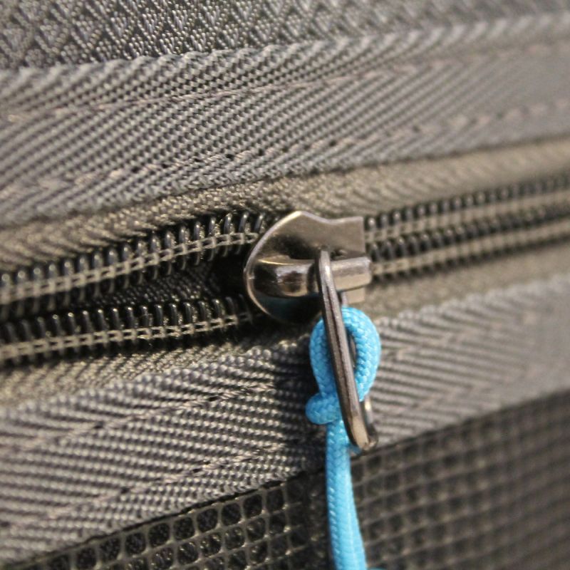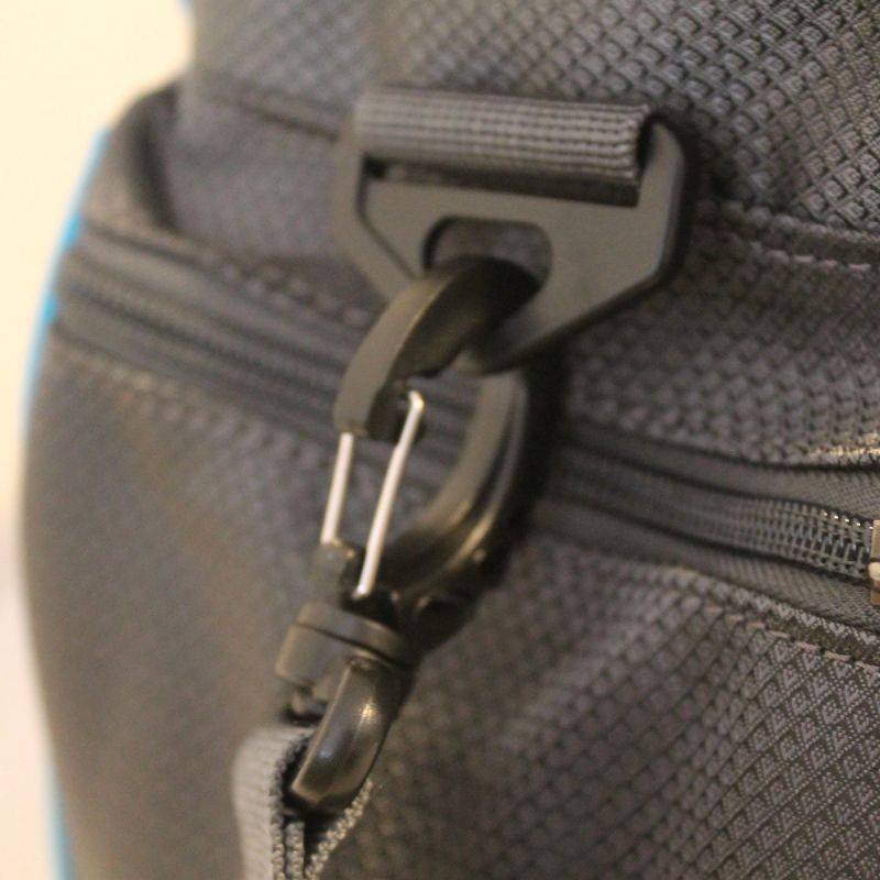 Material premium: tela texturizada gris grafito con detalles en celeste aqua que facilitan la identificación del bolso entre el equipo.