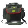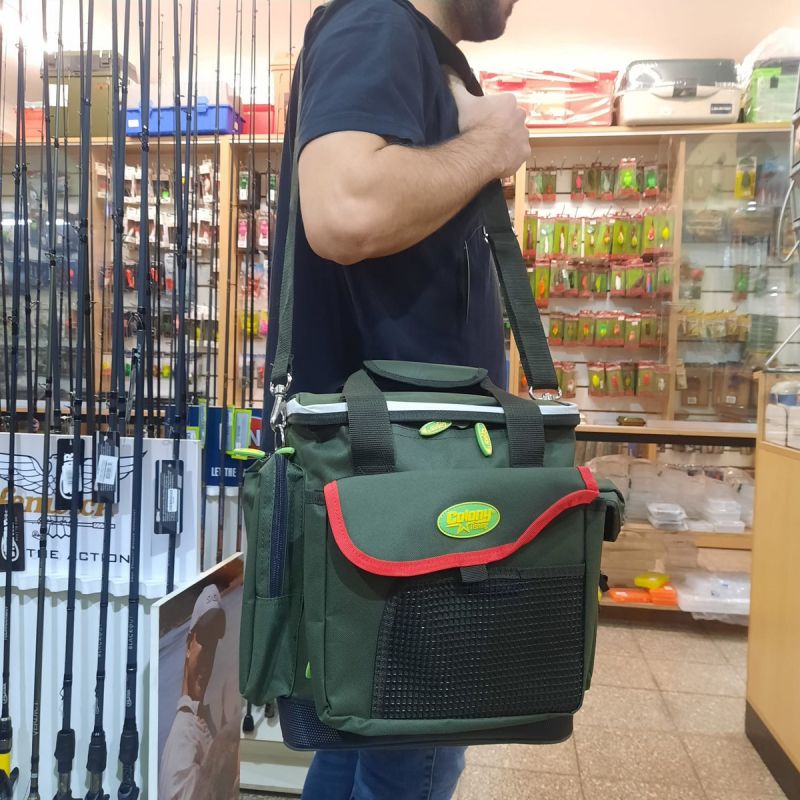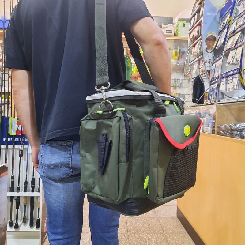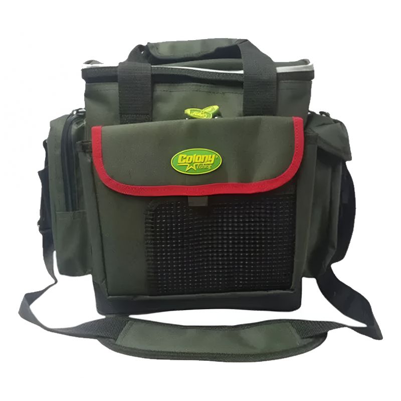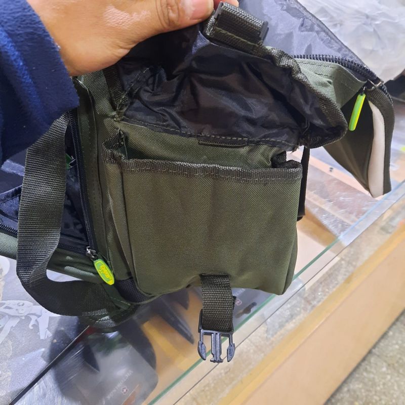 Tres bolsillos al frente, uno cuenta con doble cierre y divisores en su interior; el otro tiene tapa con broche de plastico y el ultimo es del tipo mesh con cierre a velcro