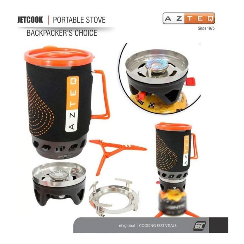 Cuenta con un soporte plástico para estabilizar el cartucho de gas (compatible con los dos diámetros de cartucho en el mercado), una olla de aluminio, con un soporte extra para poder calentar con marmitas convencionales, lo que hace que la cocina Azteq Jet Cook sea más versátil.