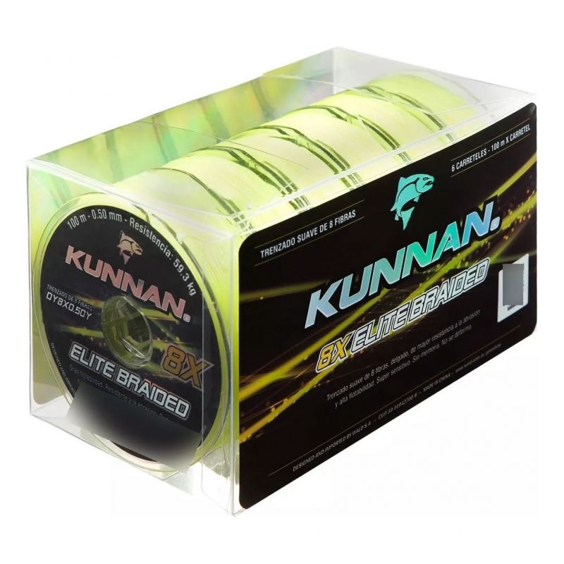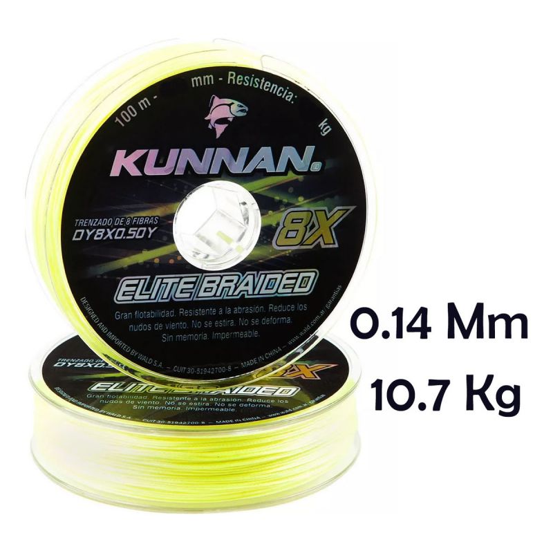 8X ELITE BRAIDED de KUNNAN® es el Multifilamento resultante de la aplicación de última generación tecnológica en el trenzado circular suave de 8 filamentos. Como resultado estas líneas delgadas resisten mayor peso, soportan mejor la abrasión y tienen una alta resistencia a la tirantez extrema. 0% de elasticidad asegura que las líneas no se deforman ni poseen memoria. La durabilidad en el color facilita su visibilidad. Su diseño es óptimo, permitiendo lanzamientos exactos a mayor distancia en condiciones extremas o turbulencias en el mar, ríos y lagos.
