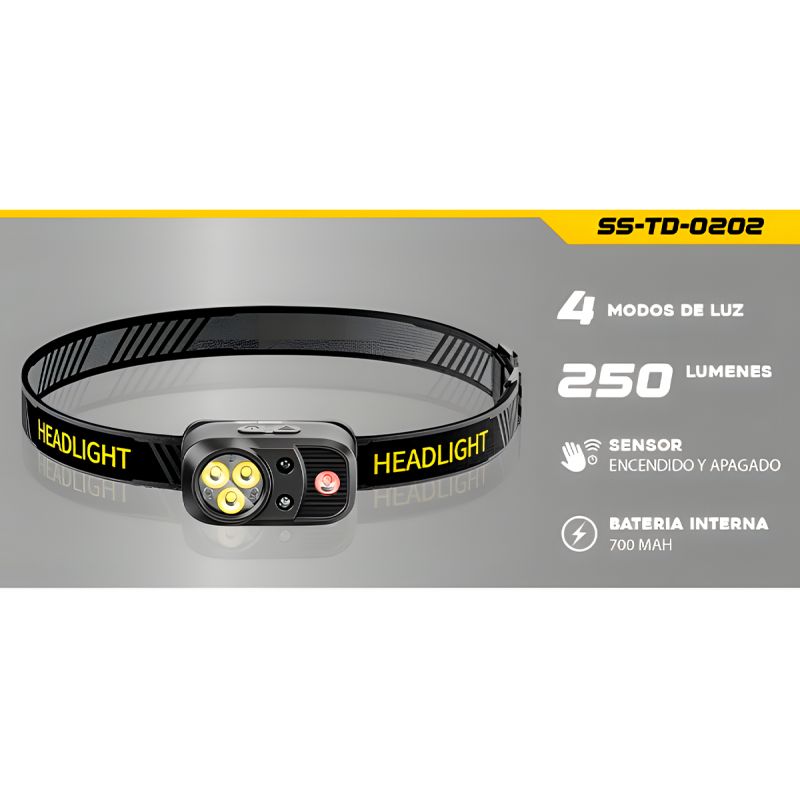LINTERNA DE CABEZA Lexus SS-TD-0202 250 LUMENS 4 FUNCIONES LUZ BLANCA Y RFOJA SENSOR DE ENCENDIDOY APAGADO BATERIA INTERNA 700 mah