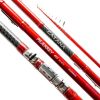Construida sobre un blank de carbono de alto módulo, se presenta en dos largos diferentes. 4,20 metros, ideal para la pesca en Lagunas y 4,50 metros, para pesca a largas distancias sin perder potencia de clavada. Terminada con un tip de carbono súper sensible se dividen ambas en 5 secciones, y 10 pasa hilos más puntero. Incluye porta reel a cremallera, protector de pasa hilos y funda de transporte.