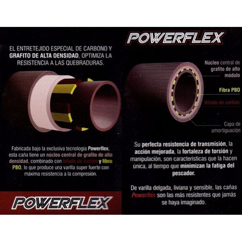POWERFLEX: Fabricada bajo la exclusiva tecnología Powerflex, esta caña tiene un núcleo central de grafito de alta densidad, combinado con hilado de carbón y fibra PBO. De varilla delgada, liviana y sensible, las cañas Powerflex son las más resistentes que jamás se haya imaginado. Su perfecta resistencia de transmisión, la acción mejorada, la fortaleza de torsión y manipulación, son características que la hacen única, al tiempo que minimizan la fatiga del pescador.