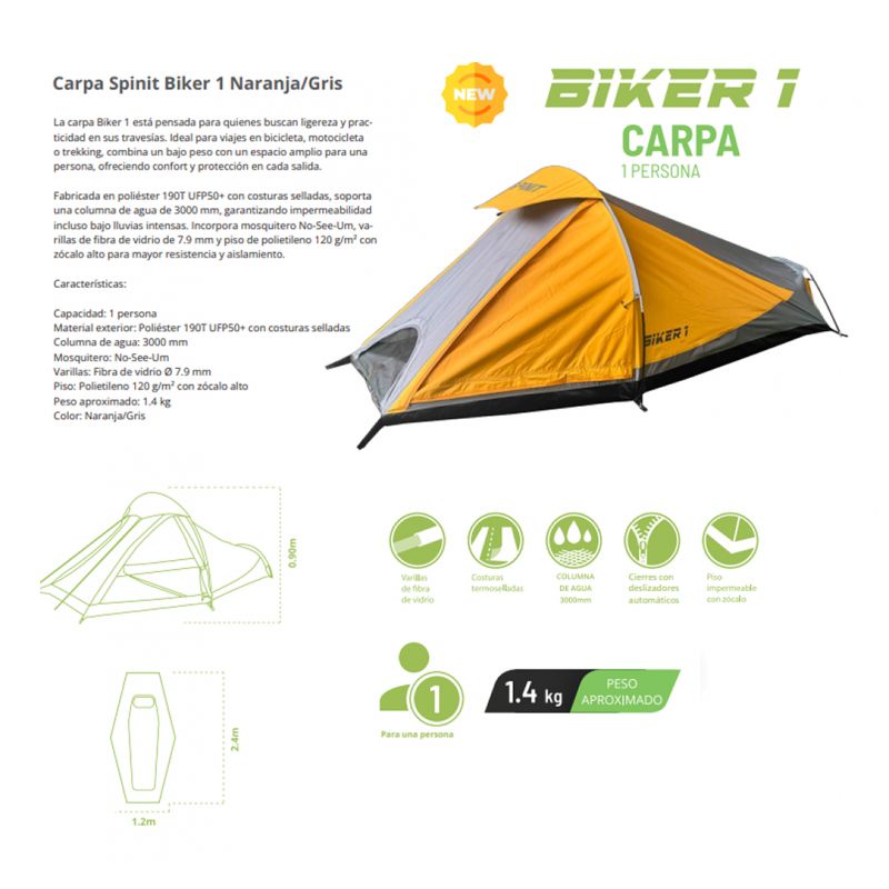 La carpa Biker 1 está pensada para quienes buscan ligereza y practicidad en sus travesías. Ideal para viajes en bicicleta, motocicleta