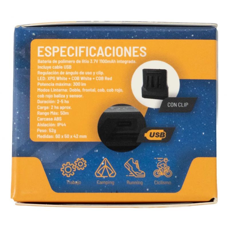 Equipada con batería recargable de litio y conexión USB, brinda una autonomía de 3 a 4 horas y un tiempo de carga de solo 2 horas, lo que la hace práctica y eficiente. Con un diseño ergonómico y peso ultraliviano, resulta cómoda de llevar gracias a su vincha ajustable.